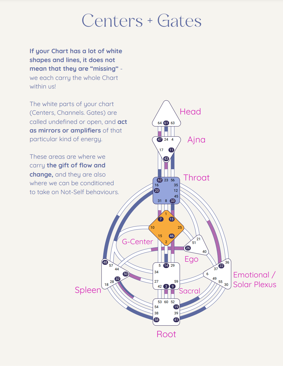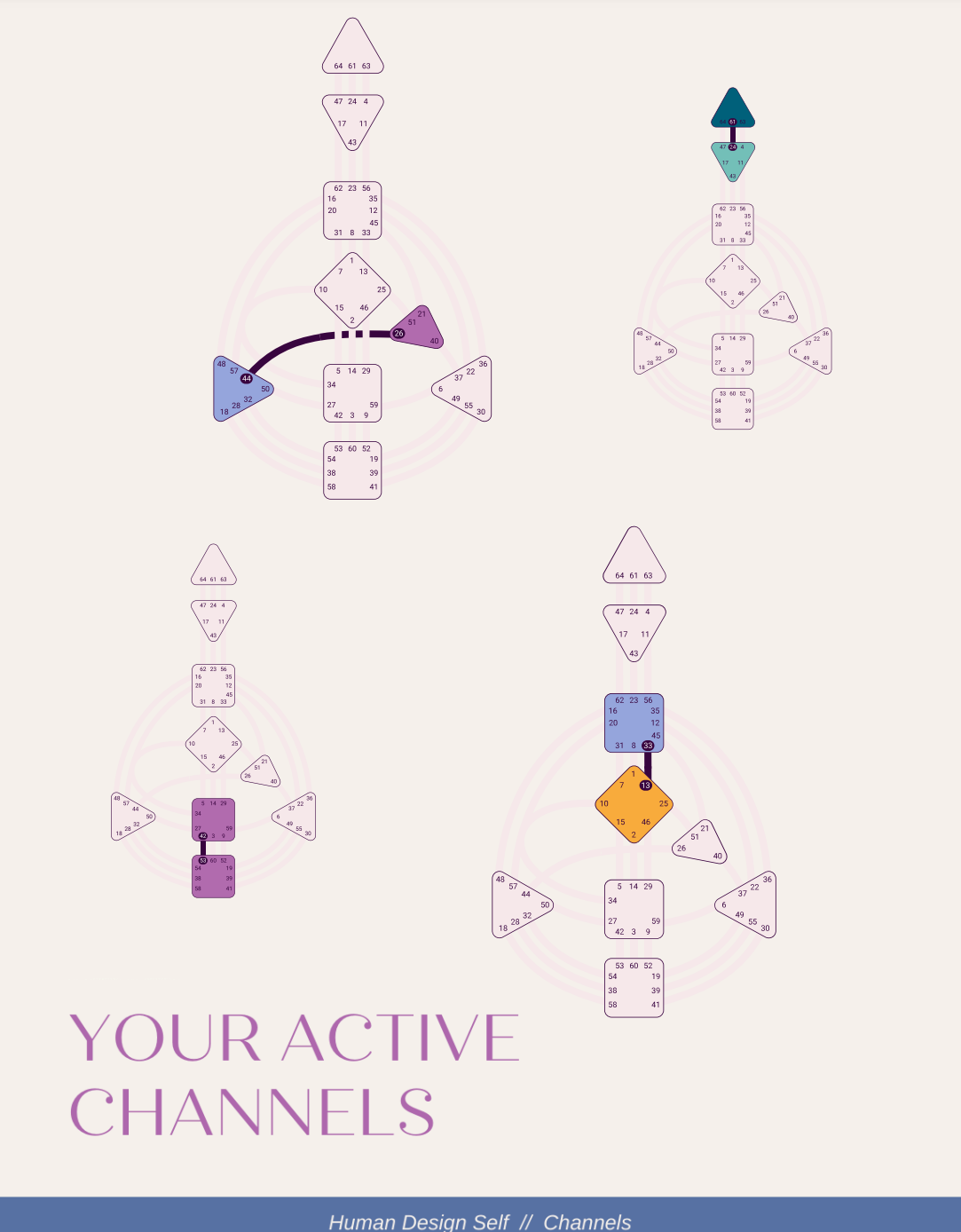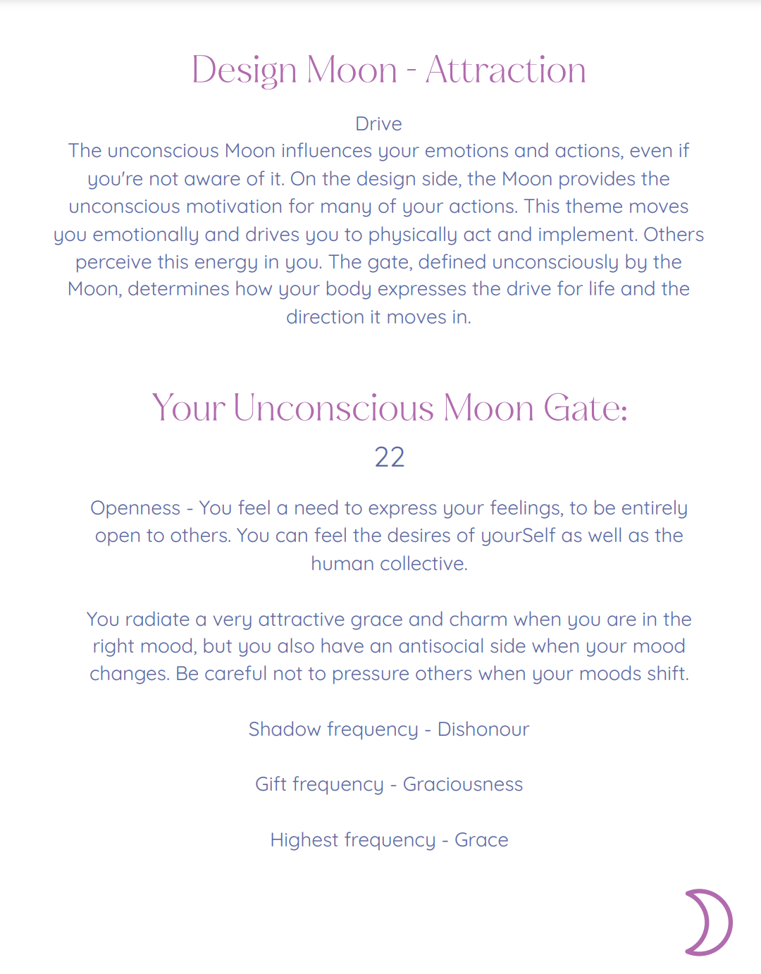 In the Full Report, you'll discover 100+ pages of new insights into your Authority, Strategy and Theme, Not-Self Challenges, Childhood themes, and the nuances of your active Gates, Channels, and even the mind + body analysis of your Variables - Digestion, Environment, Awareness, and Perspective.