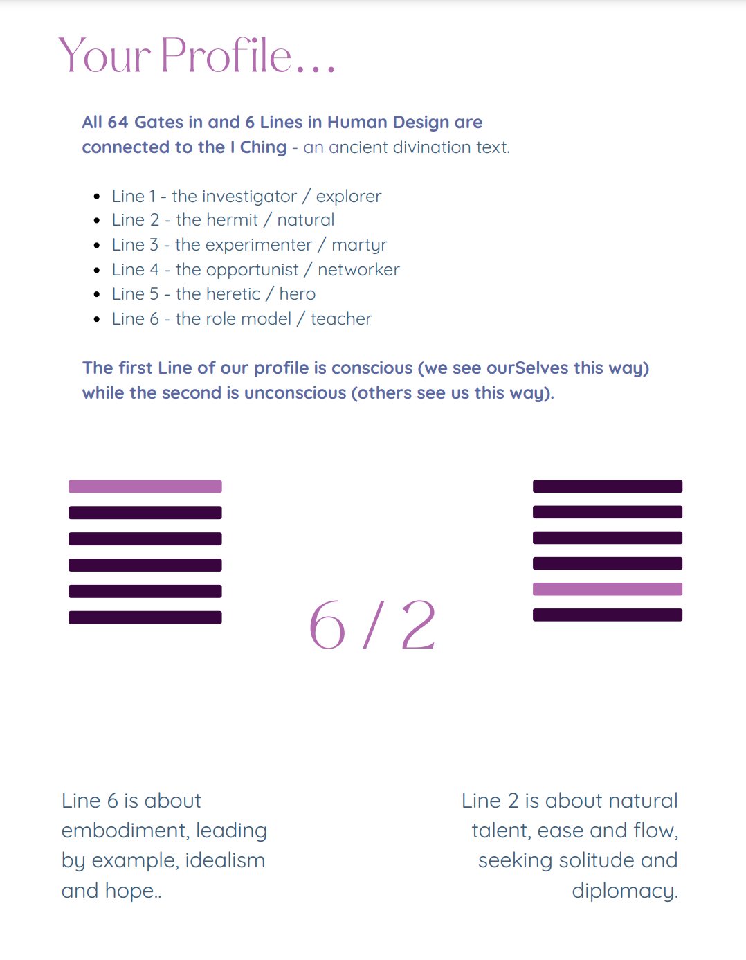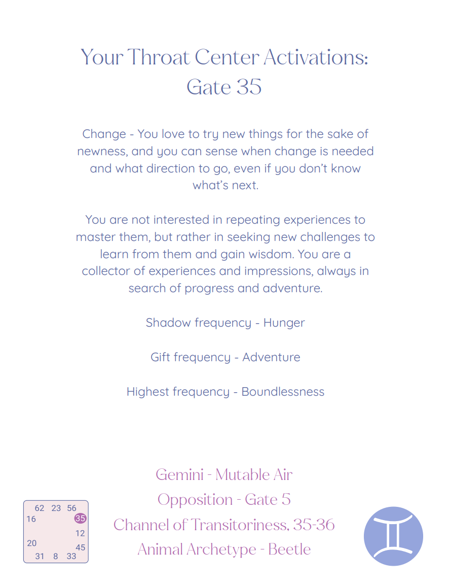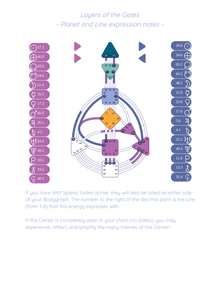 In the Full Report, you'll discover 100+ pages of new insights into your Authority, Strategy and Theme, Not-Self Challenges, Childhood themes, and the nuances of your active Gates, Channels, and even the mind + body analysis of your Variables - Digestion, Environment, Awareness, and Perspective.