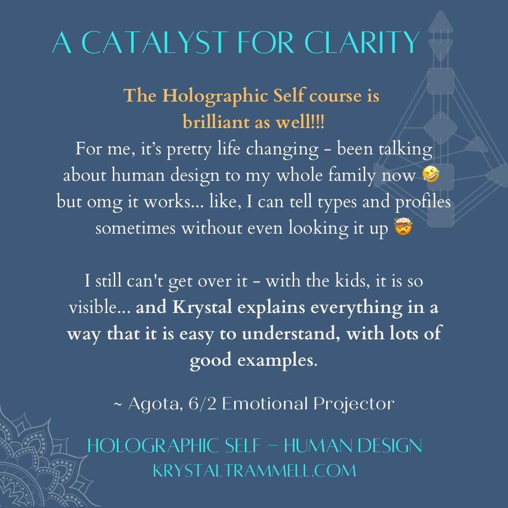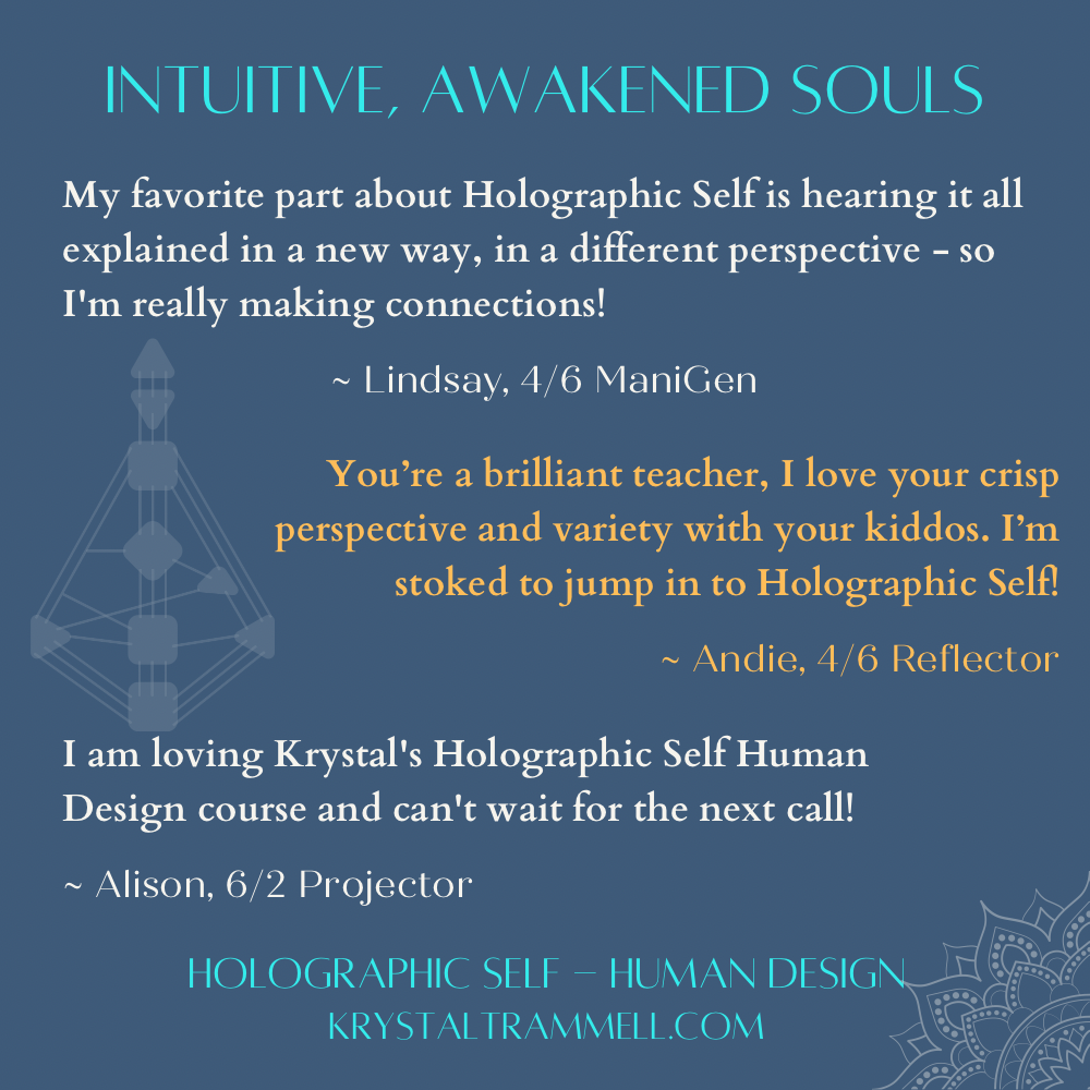 "Thank you for opening the doors to Parenting by {Human} Design. You’re a brilliant teacher, I love your crisp perspective and variety with your kiddos. I’m stoked to jump in to Holographic Self (with Taurean reflector speed)!"