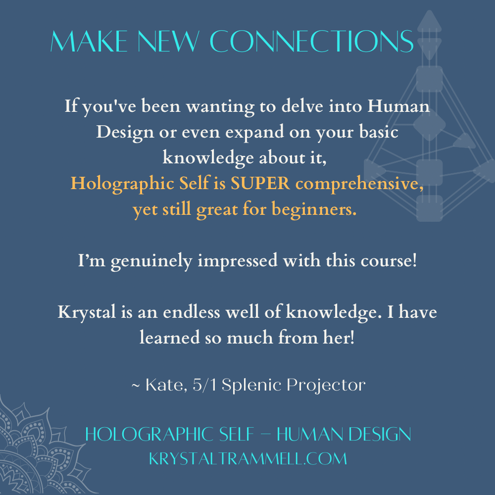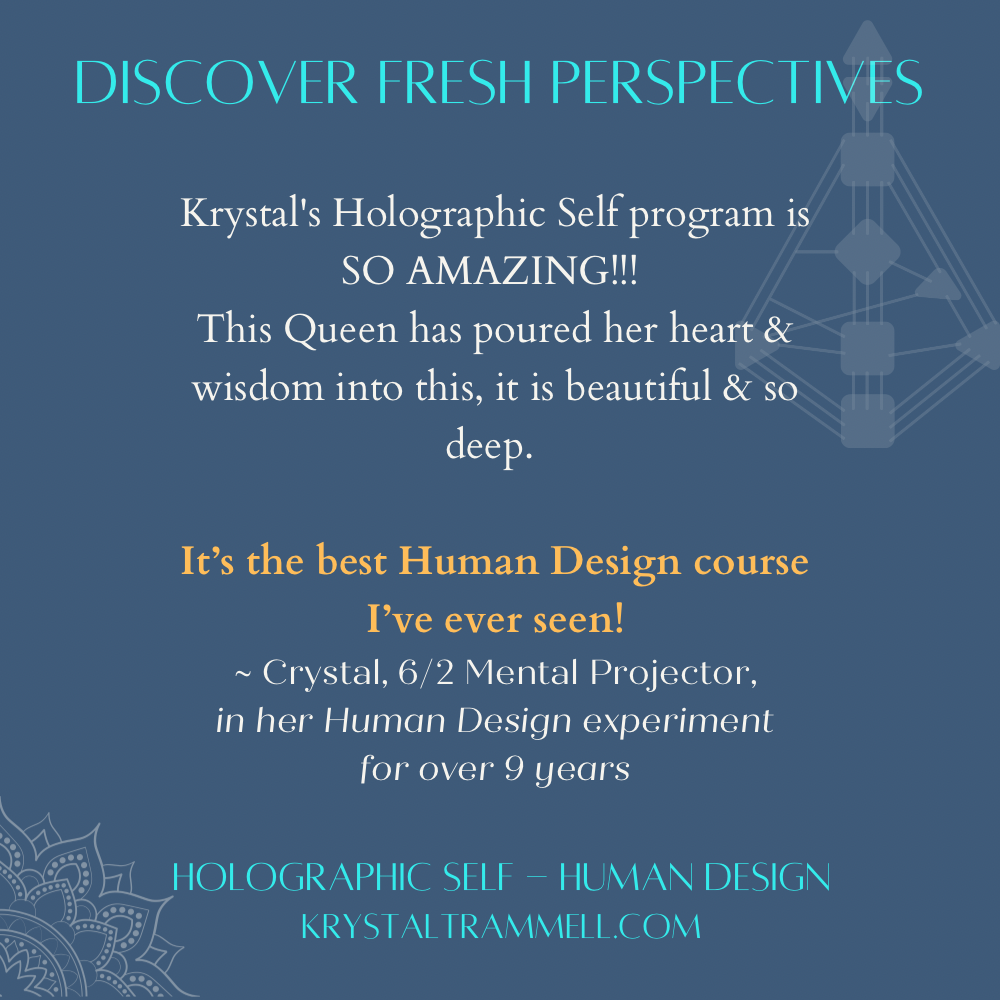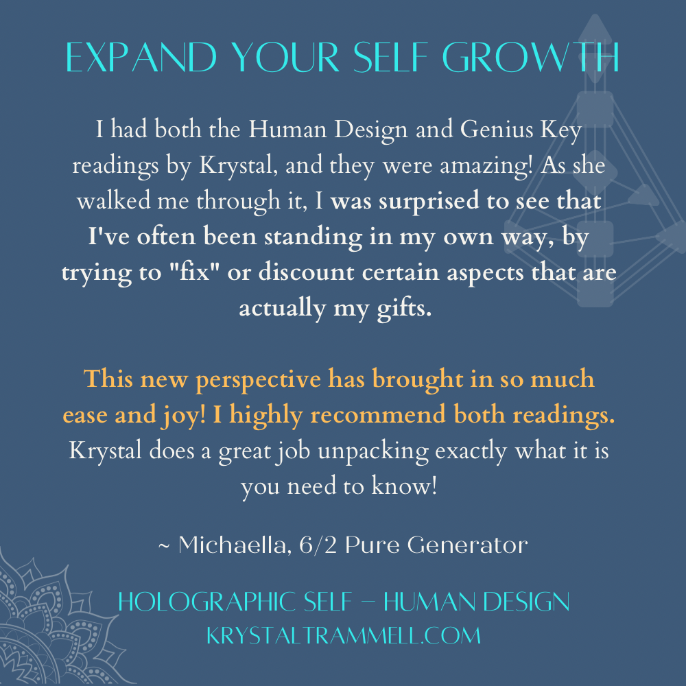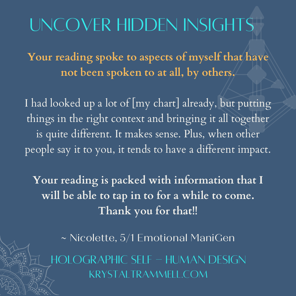 "Krystal’s Human Design session was a powerful and illuminating experience. She is very knowledgeable and intuitive person with the power to explain intricate information in simple terms, easy for someone new to human design. The accuracy of the information she presented truly surprised me—in the best way possible!